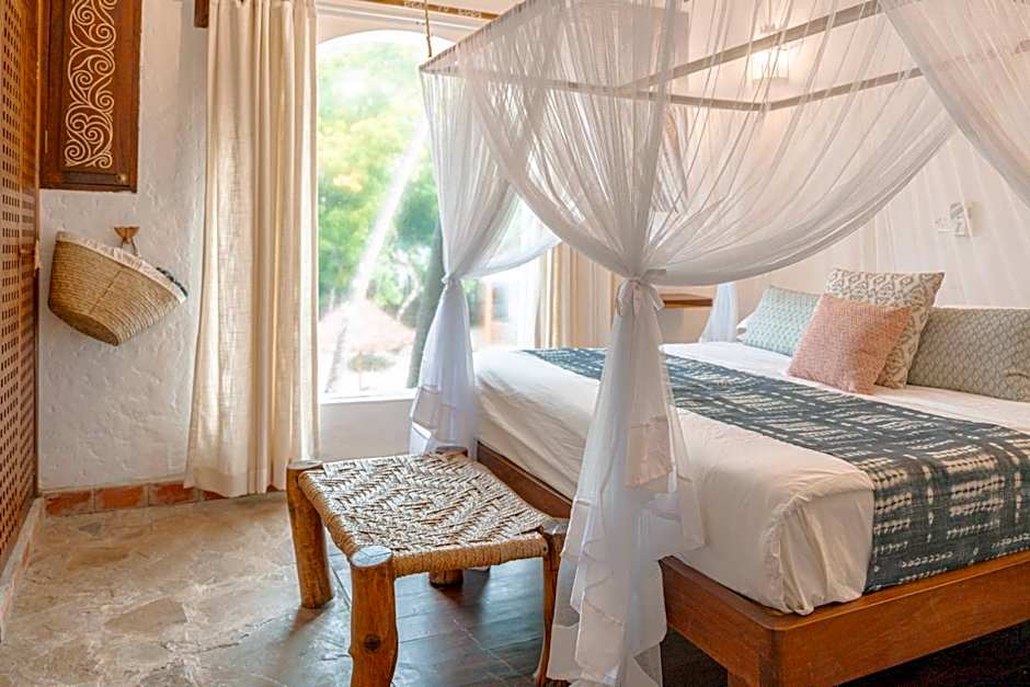 These suites offer a private veranda with ocean view. They are equipped with a an AC, fan, and mosquito nets. The bathroom has a stone shower and double washbasin. All rooms have a king size bed. The ground floor suites can be equipped with an extra bed for one person. The top floor suites have a third bed, which is 80x188cm, that doubles as a bed and/or a daybed/sofa.