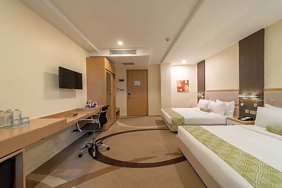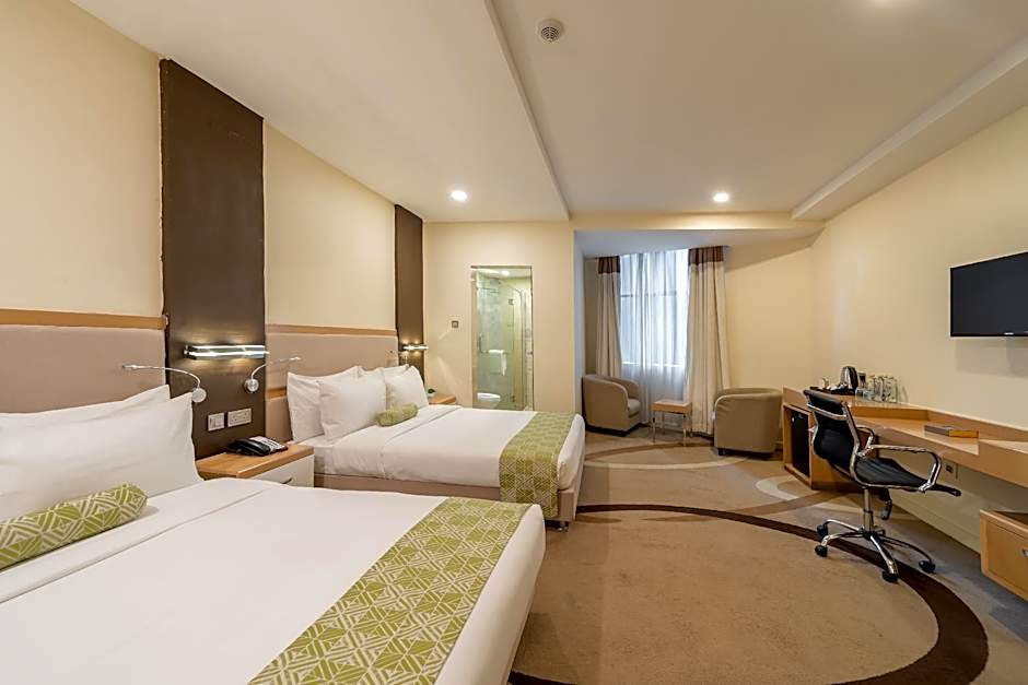 This air-conditioned deluxe room features a flat screen TV with satellite and cable channels and sofa. Guests can make use of the electric kettle, mini-bar and ironing facilities available in the unit. The room also enjoys views of the city.