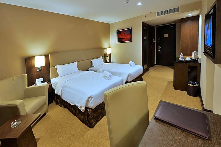 Lintas View Hotel offers various room types including Premier King Rooms, Superior King Rooms, Executive King Rooms, Superior Twin Rooms, Junior Suites, Executive Twin Rooms, and Premier Twin Rooms. All rooms are non-smoking. The rooms can accommodate 2 adults and 1 child and are equipped with either a king-size or queen-size bed, with twin bed options available in the twin rooms. The room sizes range from 291 sqft to 420 sqft.