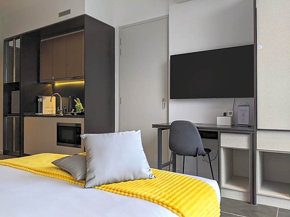 A variety of room configurations are available, including a Studio with a King Bed, Deluxe Rooms (1 Bedroom and 2 Queen Beds), and Suites such as those with two Queen Beds and a dedicated bedroom. Smoking is not allowed in any room, and upper floors are accessible by elevator, ensuring easy movement around this stylish base.