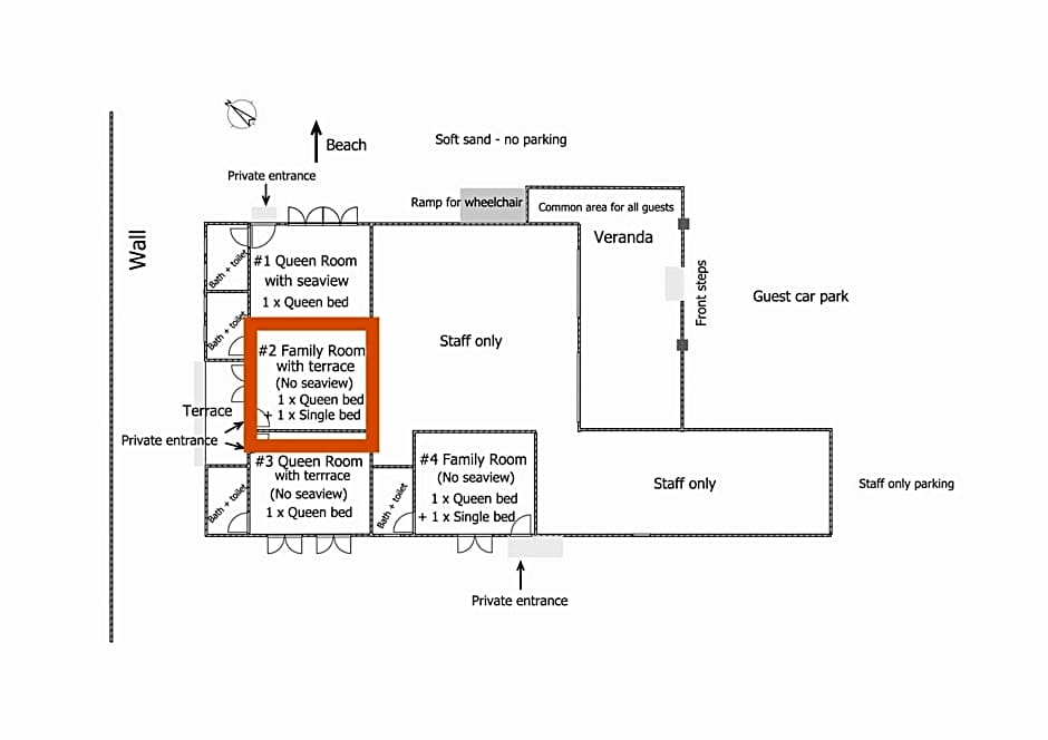 Room options span several styles to fit different needs, from the Queen Room, Sea View with a queen-size bed to Room, Terrace, Family, Terrace, Family, and Standard Room. Each option accommodates up to 2 adults and 1 child and all are non-smoking, providing a relaxed, smoke-free retreat after a day in the sun. The Queen Room, Sea View offers sea-scape views to enhance the mood of oceanfront days and breezy evenings.