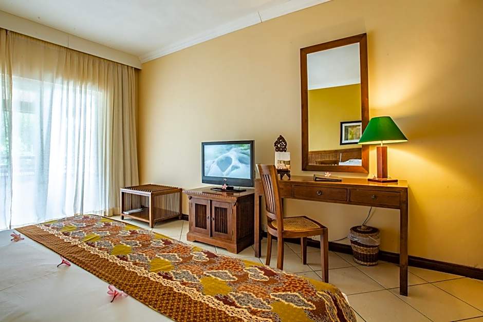 This room is elegantly decorated with wooden furniture and tiled floors. It includes a LCD TV with satellite channels.