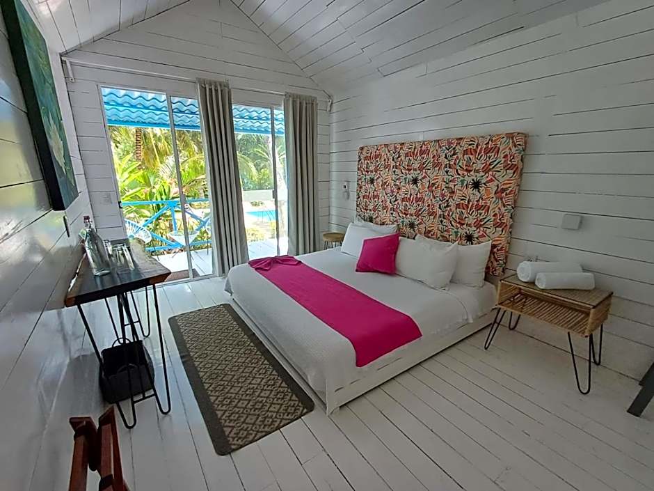 Room options include the Deluxe Cabin (non-smoking, accommodates 2 adults) and another option labeled Room Selected At Check In (non-smoking, accommodates 2 adults). The Deluxe is a 484-square-foot, non-smoking double room with a king-size bed, offering comfortable space for two adults (and up to one child) to rest after new discoveries in Bacalar.