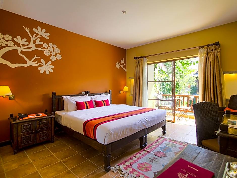 Rustic-style room features a private bathroom and a veranda overlooking the inner courtyard and landscaped gardens.