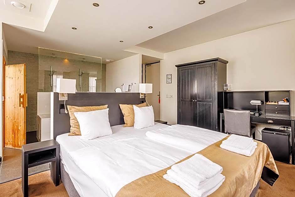 Spacious suite featuring in-room wellness facilities (e.g., sauna or jacuzzi). Includes hospitality conveniences such as tea and coffee (via lounge), bottled water, access to the Heerenlounge, a light snack moment during your stay, and bathrobes with slippers provided.