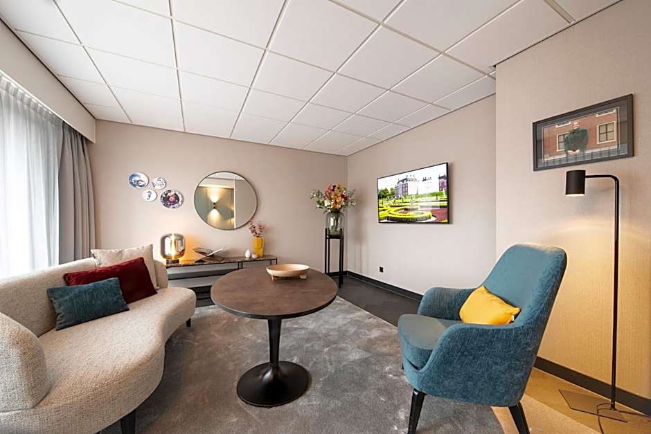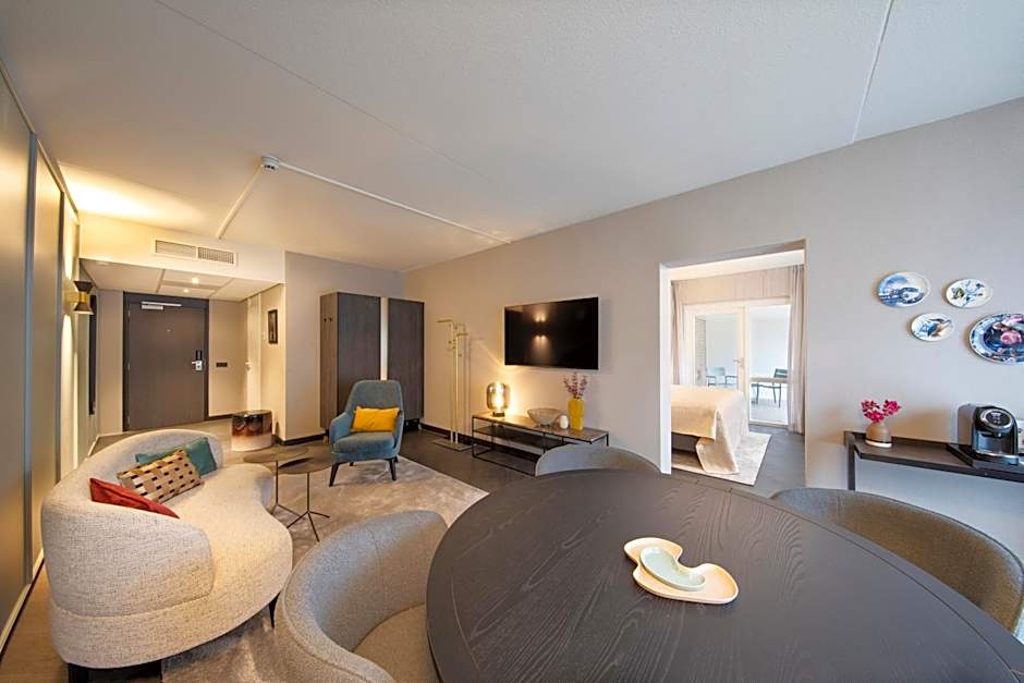 A suite with a separate bedroom with king size bed and seating area, Nespresso coffee machine, tea facilities, desk, mini-bar and balcony. The bathroom is provided with a bath tub and separate shower. Bath robes and slippers are available in this suite.