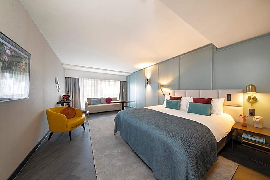 The spacious hotel room includes a seating area, coffee and tea facilities, bathrobes and slippers, a mini-bar and balcony. The bathroom is equipped with a bath tub and separate shower.