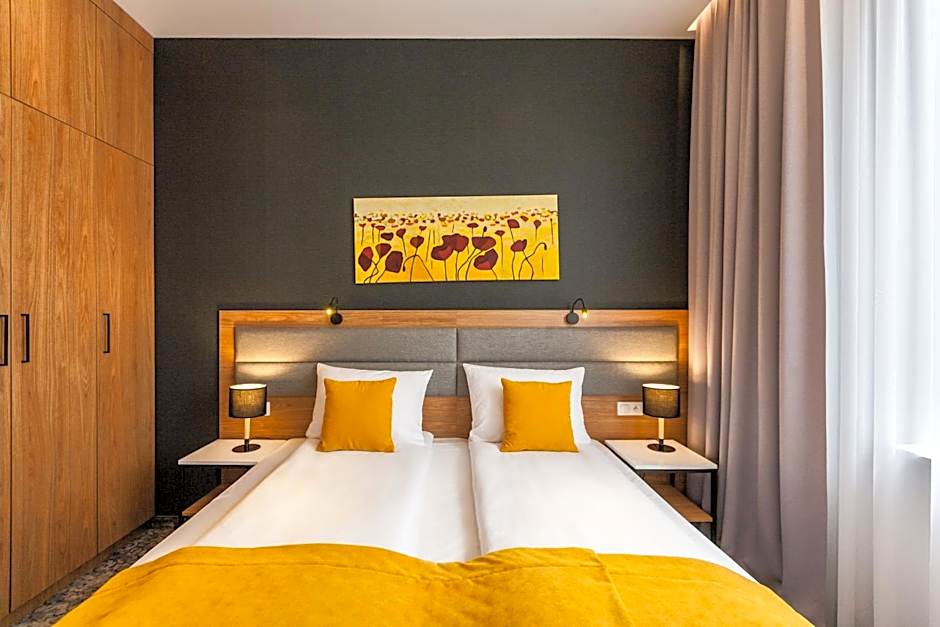 The hotel offers one-bedroom apartments, deluxe apartments, and double rooms. Smoking is not allowed in any of the rooms. The one-bedroom apartments and deluxe apartments can accommodate up to 5 adults, while the double room can accommodate 2 adults. The room sizes range from 205 sqft to 560 sqft. The bedrooms in the apartments have either a queen size bed or a double bed, and some rooms also have sofa beds.