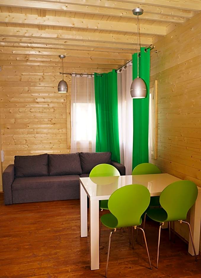 A wooden chalet with a living room, a well-equipped kitchenette, a bathroom with a shower and a roofed terrace with garden furniture.