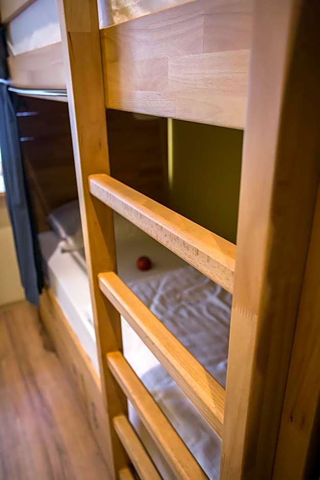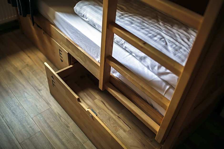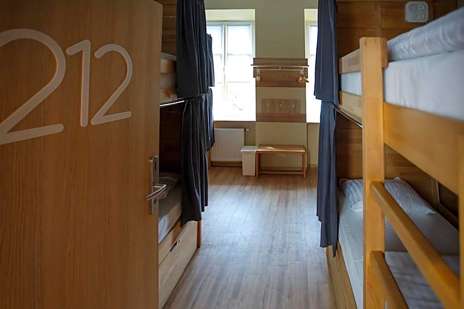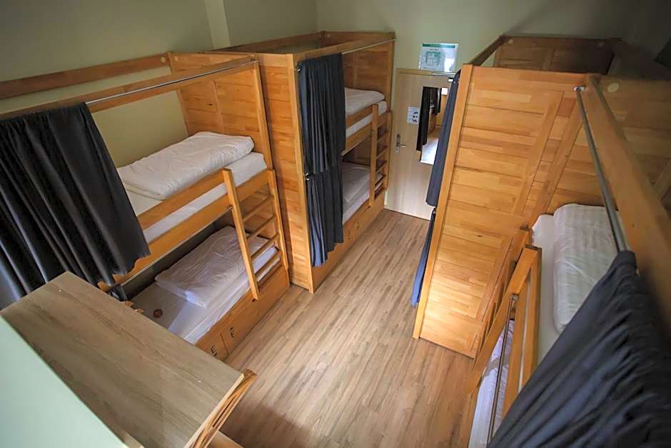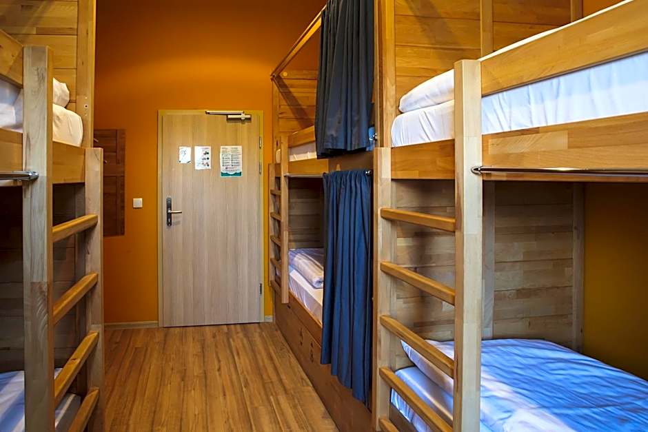 A bed in a mixed dorm room with 4 large bunk beds featuring orthopedic mattresses. Each bed comes with a curtain, individual lighting, 2 sockets and a shelf. There are lockers under every set of bunk beds, as well as a mirror and coat hangers in every room. Guests in this room type have access to shared bathroom facilities.