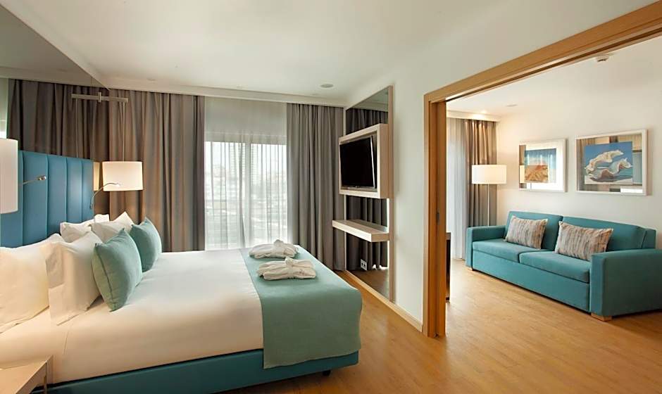 The TURIM Presidente Hotel offers a variety of room types, including Suites and Double Rooms. The Suites are available with either a frontal or lateral sea view and vary in size from 366 to 431 square feet. They accommodate up to 3 adults and 2 children and feature a double bed and a sofa bed. The Double Rooms, available with either a frontal or lateral sea view, are 280 square feet in size and accommodate 2 adults and 1 child. They have either 2 twin beds or 1 queen size bed. Smoking is not allowed in any of the rooms.