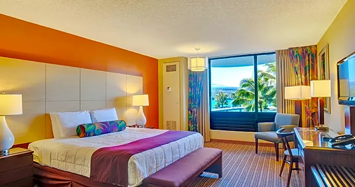 Expect an old hotel. Our room was clean and comfy, I was just hoping theres a microwave to heat up food. Theres 4 of us and there was just 2 towels so I asked for more. There was a buffet with crab legs that costs $69 I think that comes with $10 coupon, which is still expensive for me. Location wise, it's near the airport and downtown, so convenient and accessible to everything. Its in front of the beach and near a popular park. The place has a very relaxing vibe. You will see the locals fishing near the hotel. You will see big fish and turtles while sitting at the beach wall. Parking is not a problem. I will come back for the vibe.