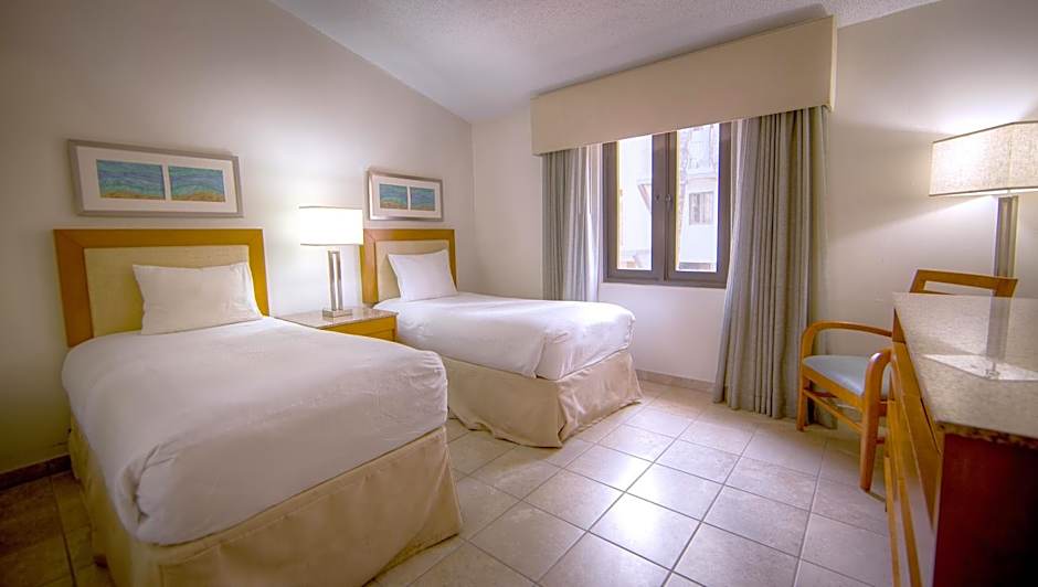 The hotel offers suites and villas for accommodations. The Two-Bedroom Villa has a room size of 1389 sqft and can accommodate 6 adults and 5 children. It has a king size bed, twin beds, and a sofa bed. Smoking is not allowed. The Three-Bedroom Villa is larger, with a room size of 1572 sqft, and can accommodate 8 adults and 7 children. It has double beds, twin beds, and does not allow smoking. The One-Bedroom Villa has a room size of 947 sqft and accommodates 4 adults and 3 children. It has a king size bed, a sofa bed, and does not allow smoking.