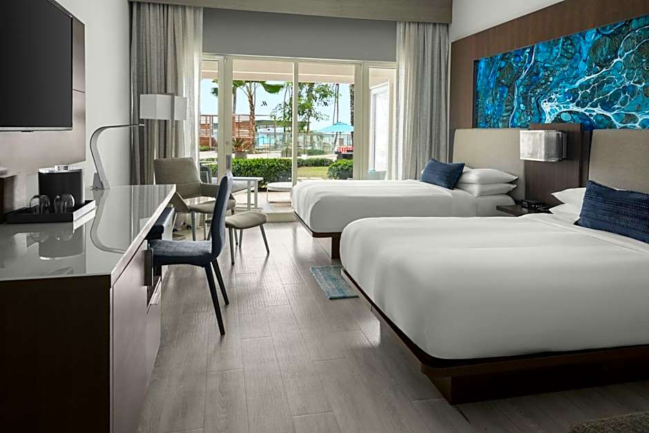 The San Juan Marriott Resort and Stellaris Casino offers various types of rooms including Ocean Front Rooms with two double beds or a king bed, Corner Ocean View Rooms with two double beds, King Cabana Lanai with pool access, Ocean View Rooms with two double beds or a king bed, Double Rooms with two double beds and accessibility features, King Corner Larger Ocean Front Rooms, Presidential Suite, Double Rooms with two double beds and roll-in shower accessibility, Ocean View Rooms with cabana wing, King Studio Suites with city and pool view, King Studio Suites with sofa bed and pool view in the Cabana Building, King Corner Larger City View Rooms, City View Rooms with two double beds, and City View Rooms with a king bed. These rooms accommodate various numbers of adults and children, have non-smoking policies, and range in size from 248 sqft to 624 sqft.