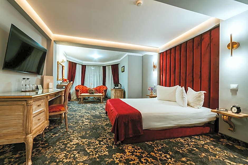 Each suite has a unique styling, and a view of the Roman Plaza or the Golf Course. They include a bedroom with a TV, a living room with a sofa and armchairs, and a private bathroom with a bath or shower and free toiletries.