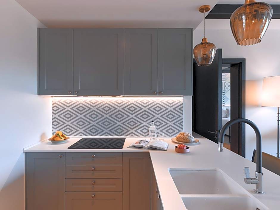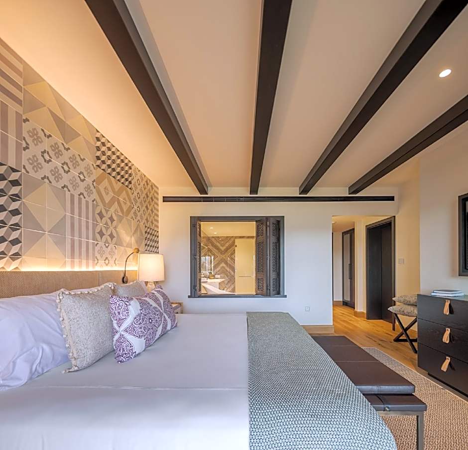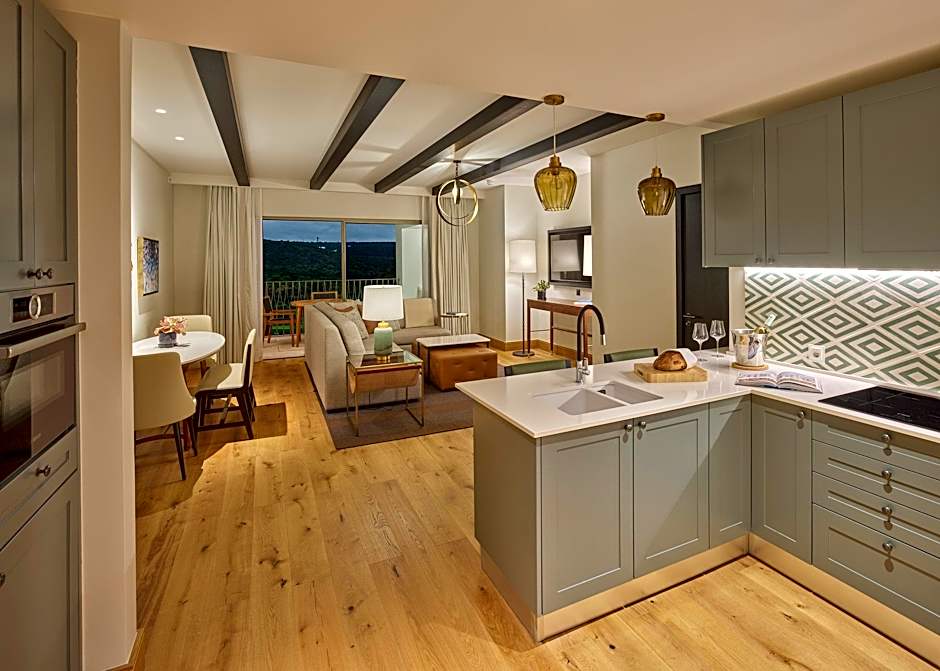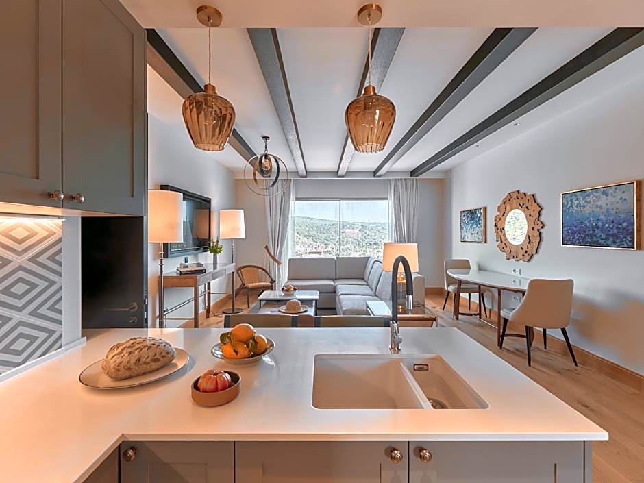 Spacious and elegantly decorated suite with a living area with a sofa and a flat-screen TV.