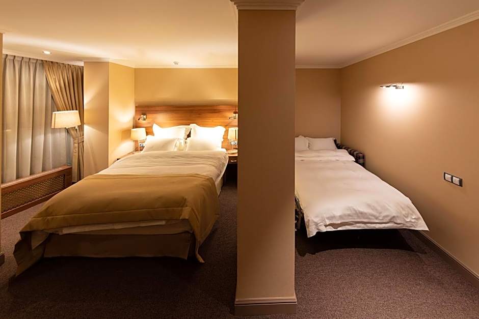 The Daria Suite hotel offers three types of rooms: Double Room, Studio, and Twin Room. The Double Room has a Queen size bed and can accommodate 2 adults, with no smoking allowed. The Studio has both a sofa bed and a Queen size bed, accommodating 2 adults and 2 children, also with no smoking allowed. The Twin Room has 2 Twin beds and can accommodate 2 adults, with no smoking allowed. Room sizes range from 215 sqft to 431 sqft.