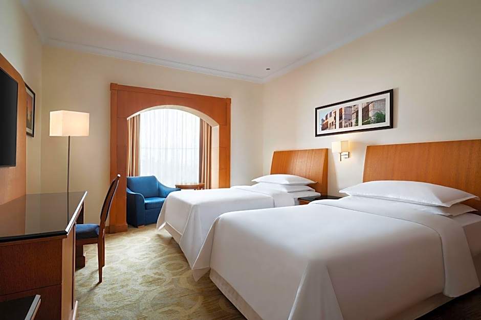 The Sheraton Jeddah Hotel offers a variety of rooms, including 4-bedroom apartments with sea views and balconies, club rooms with sea views and club lounge access, standard twin bed rooms with city views, executive suites with sea views and club lounge access, and Amiri suites with sea views. Smoking is not allowed in any of the rooms. The rooms accommodate either 2 adults and 1 child or 8 adults and 4 children, and bed options include double beds, king-size beds, queen-size beds, and twin beds.