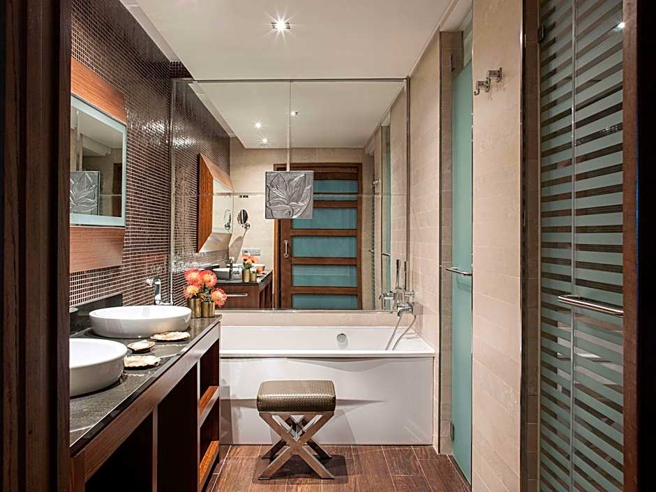 Red Level Master Suite Ocean View with Terrace Bathtub is 1066 square feet and includes a double bed 131-150 width plus balcony, terrace, satellite tv , hairdryer, tea and coffee making facilities , ironing set, safe, bathrobes, and slippers.