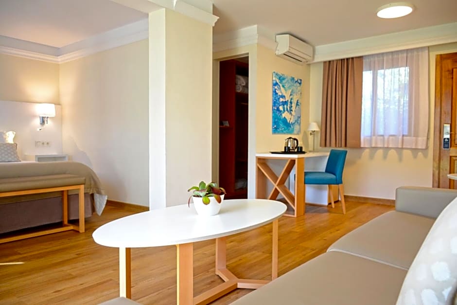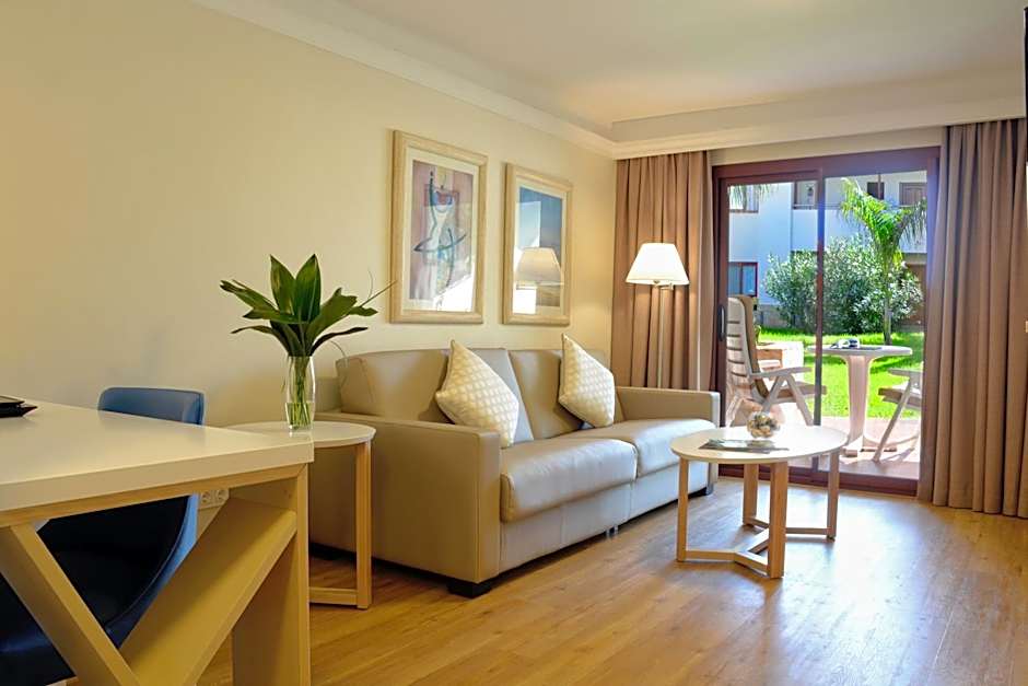 JUNIOR SUITE MY FAVORITE CLUB 1 ADULT is 452 square feet and includes either a king-size bed 150-183 width or 2 single beds 80-130 width plus a sofa bed plus living room, balcony, terrace, desk, satellite tv , hairdryer, tea and coffee making facilities , safe, bathrobes, and slippers.