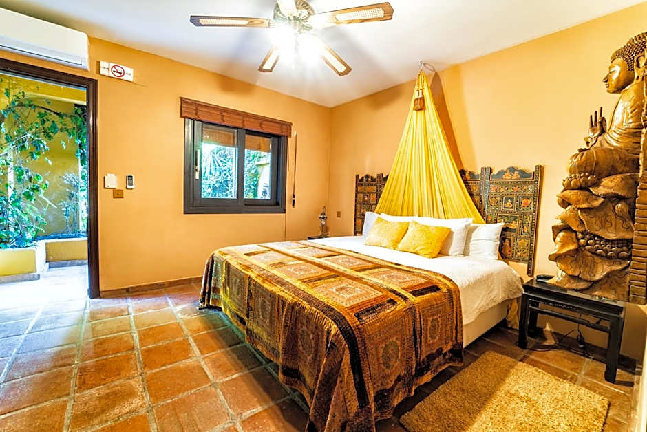A cozy room in African style on the top floor with a separate entrance and a view of the garden and the sea. There is a mini-bar, kettle and flat-screen satellite TV. The room has a separate bathroom and toilet.