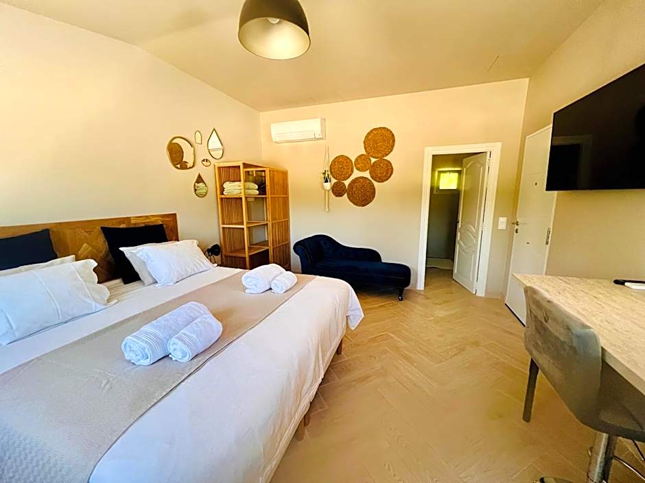 Featured amenities include an outdoor swimming pool free to guests, free private parking on site, and free WiFi. A streaming service (like Netflix) adds entertainment, while air conditioning, a private entrance, sun deck, terrace, and non-smoking rooms keep stays comfortable. Beach umbrellas, beach chairs/loungers, free toiletries, a garden, and a scenic view round out the relaxing setting.