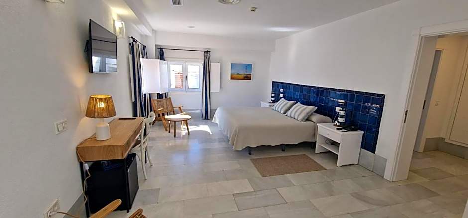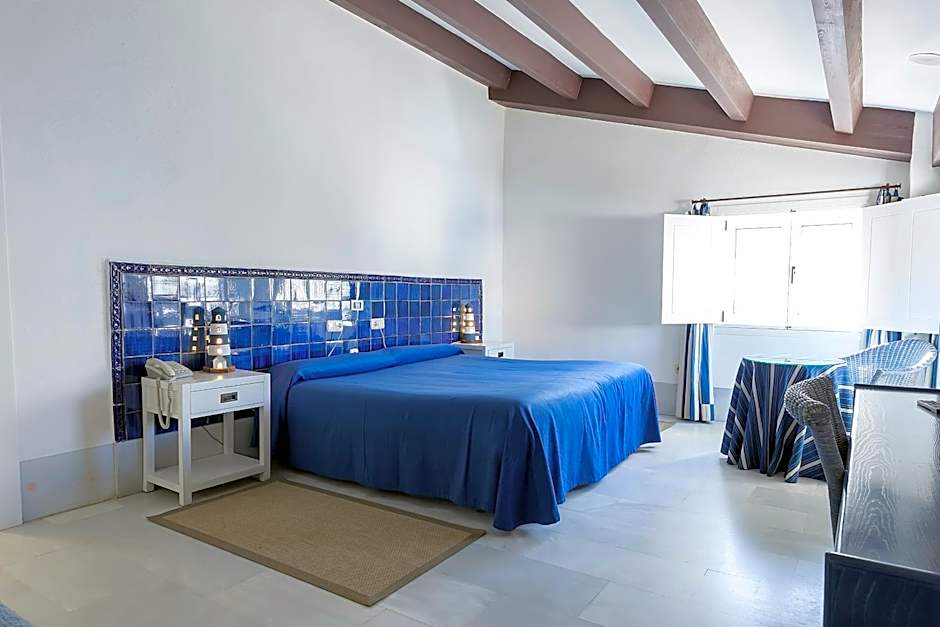 Decorated in blue and white, this room has a double bed and sofa bed. It features free Wi-Fi, a safe and TV. The mini-bar contains free water on arrival, and the bathroom includes a half-moon-shaped bath. There is a shared terrace which is divided with screens and offers views of San José Bay.
