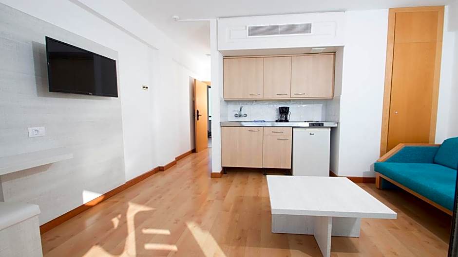 Air-conditioned apartment with a balcony and living room with a sofa bed and TV. There is a kitchenette with a fridge, and a private bathroom with a hairdryer.