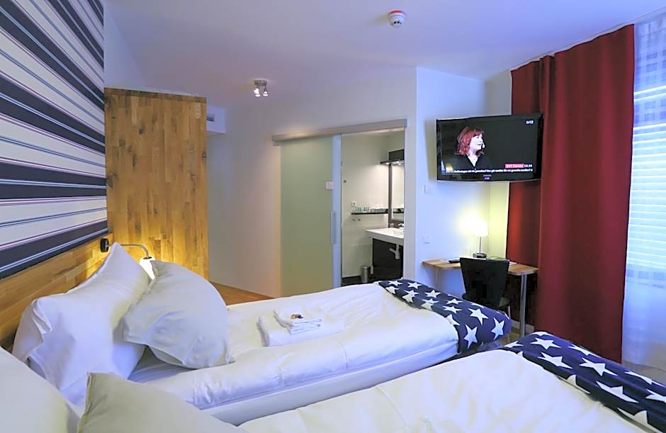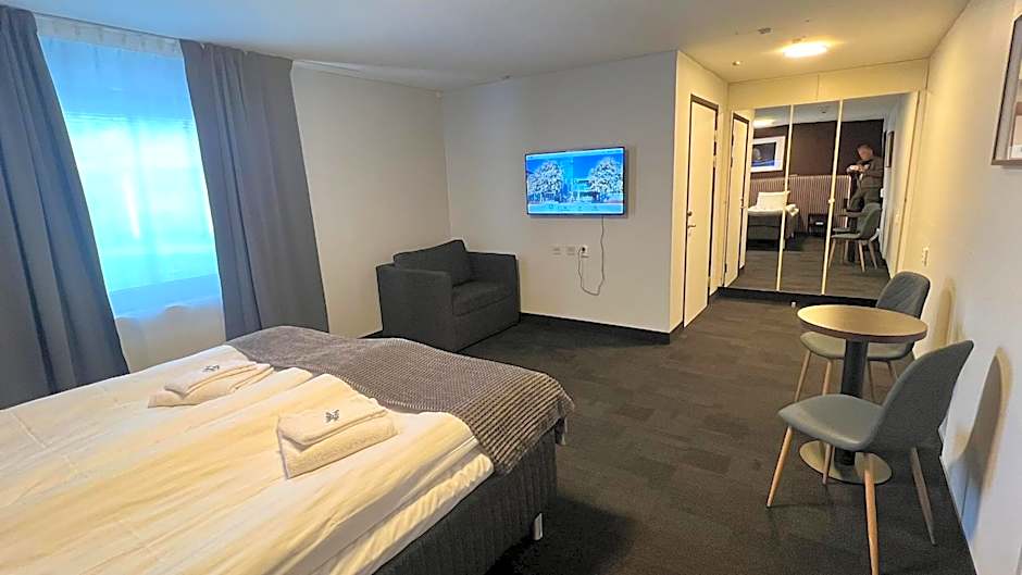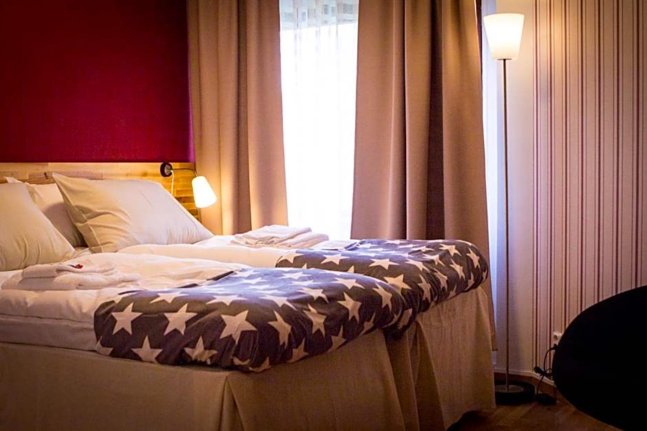 The hotel Kompassen offers a Quadruple Room that is 183 sqft in size and can accommodate 4 adults and 2 children. The room has 4 bunk beds and smoking is not allowed. Additionally, there is a Twin Room available with a size of 161 sqft, accommodating 2 adults and 1 child. The Twin Room has 2 twin beds and is also non-smoking.