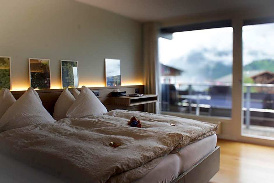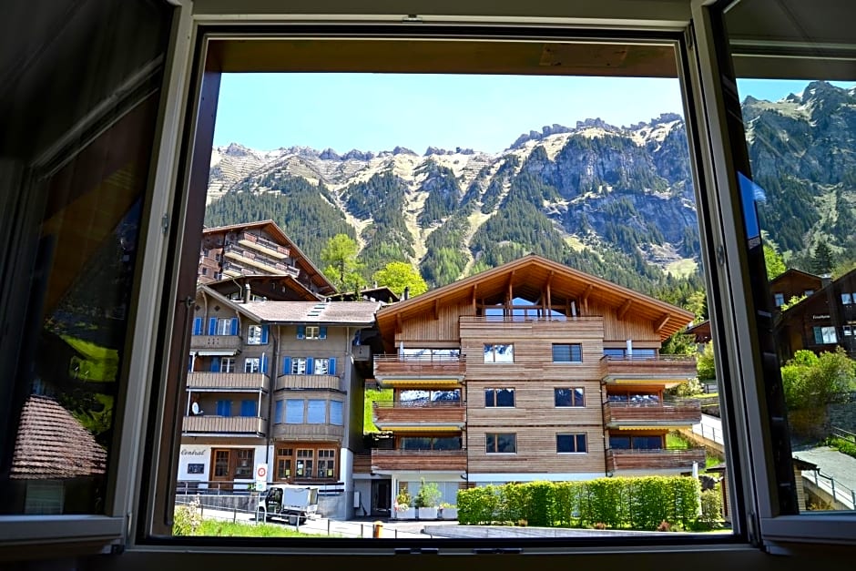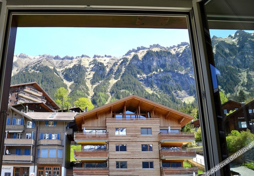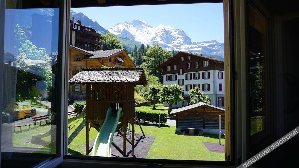 I loved the food at this hotel and restaurant. Breakfast was a simple buffet, but it included fresh-baked bread and pastries, fresh-churned butter, jams and honey, and fresh-squeezed juices. All of the cheeses, butter, and most meats were from the village or Lauterbrunnen. The dinner menu had many choices and everything was delicious and well-presented. Even my kids were able to find something they enjoyed. The staff were all incredibly kind and helpful, very hard-working. Plenty of towels were provided and the room was clean. The mugs in the room for coffee/tea were so cute and I wish I could have purchased one! Our room's view was of the buildings that faced the hotel, but even this view was stunning due to the beautiful mountains surrounding us. The view in the restaurant is stunning.