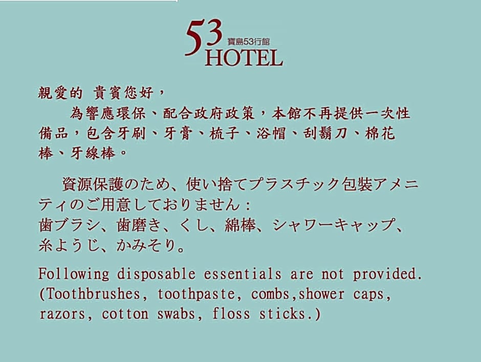 53 Hotel is a 4-star hotel in Taichung, Taiwan, located about 0,6mi from the city center. Address: No.27, Zhongshan Rd. This well-situated base puts travelers close to Taichung's sights while offering a comfortable place to rest after a day of exploring.