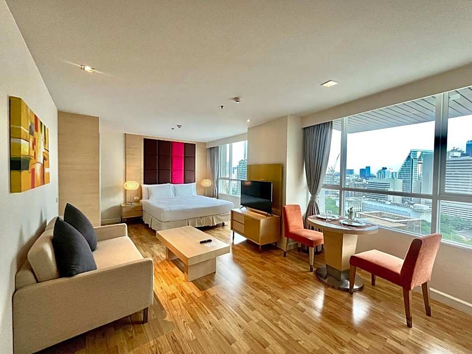 The Urbana Langsuan Hotel offers Studio rooms with a balcony, One-Bedroom Apartments, Two-Bedroom Apartments, and Premier Two-Bedroom Apartments. All rooms are non-smoking and range in size from 484 sqft to 1830 sqft. The Studio and One-Bedroom Apartments accommodate 2 adults and 1 child, while the larger apartments accommodate 4 adults and 1 child, or 6 adults and 1 child. Bed sizes vary between rooms, with options including King size, Queen size, and Twin beds.