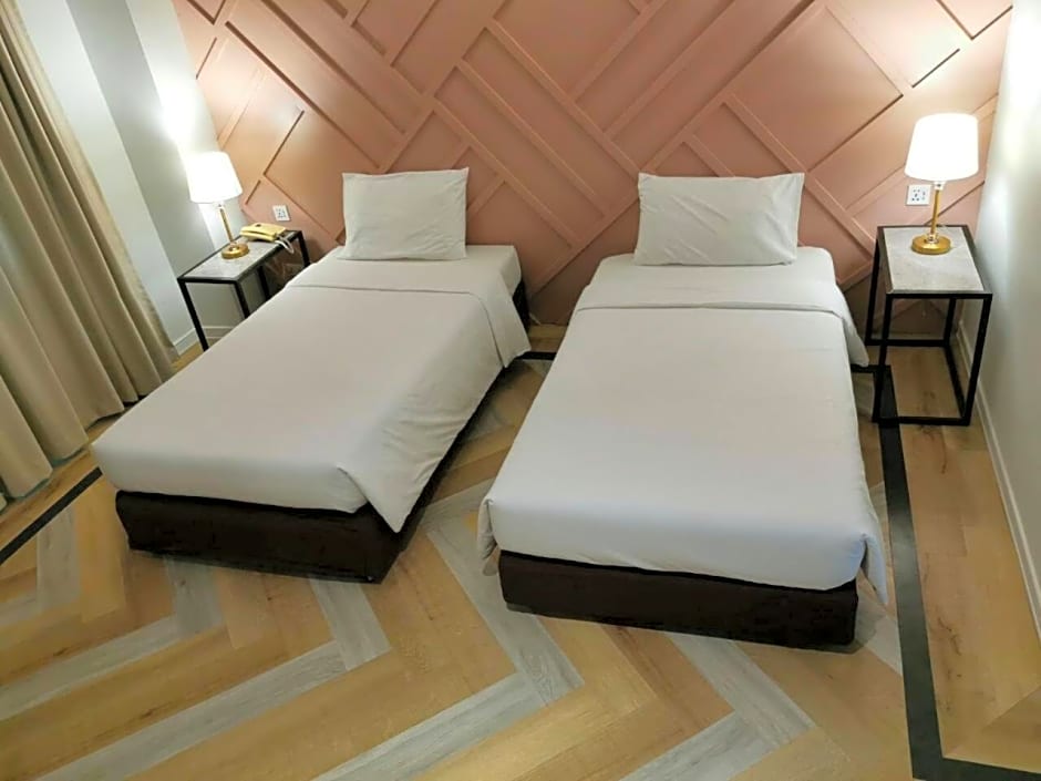 The hotel offers Deluxe Twin Rooms, with twin beds and a size of 129 sqft, accommodating 2 adults and 1 child. Smoking is not allowed in these rooms.