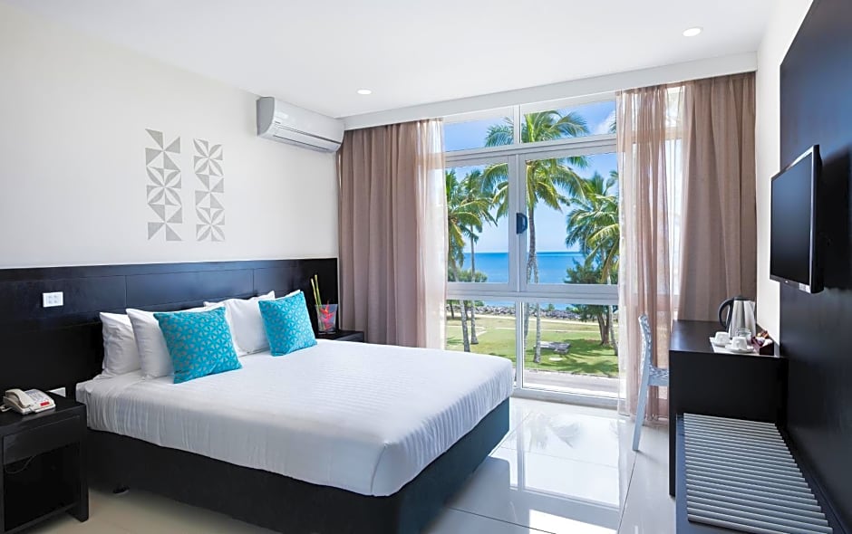 The Tanoa International Dateline Hotel offers a variety of room types, including Superior King Rooms with and without balconies, and Ocean View Queen Rooms. The occupancy ranges from 2 adults to 2 adults and 1 child. Smoking is not allowed in any of the rooms. Bed sizes include King and Queen, and room sizes range from 237 to 258 square feet.