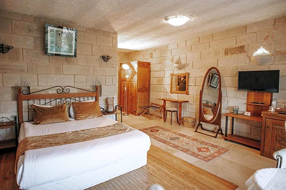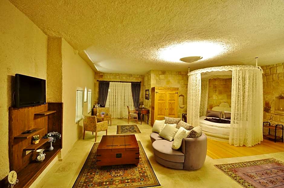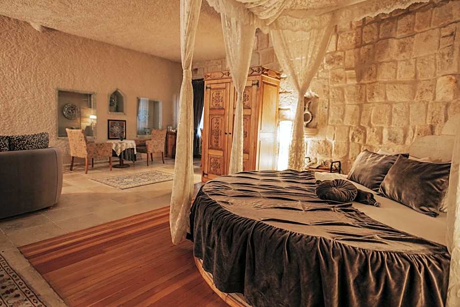 This suite has a spa bath and a round bed with surrounding curtains. It is decorated with stylish furniture and Cappadocian old carpets.