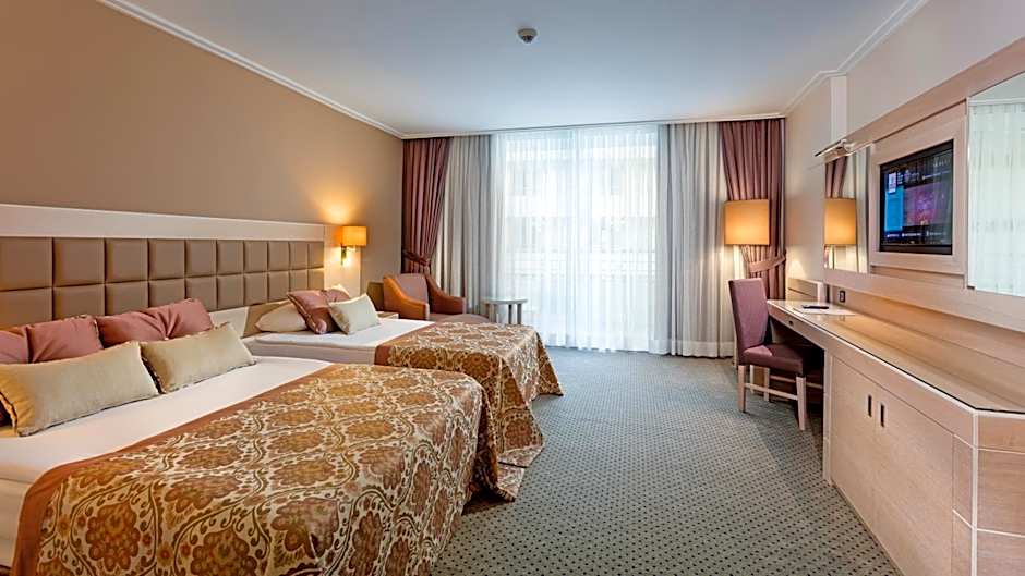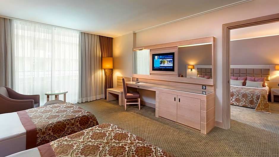 On the grounds, adventure and relaxation go hand in hand. A water park is free to enjoy, along with a private beach area, indoor and outdoor swimming pools, a kids’ pool, and a free kids’ club. Parking and Wi-Fi are free, and there’s a fitness center for staying active. Spa options, including Turkish baths, steam rooms, and saunas, are available (some spa services carry extra charges). Dining is covered by a restaurant and bar, plus a sun deck and terrace overlooking the garden. Family-friendly extras include a playground, mini golf (free), and wheelchair access with elevators for easy mobility.