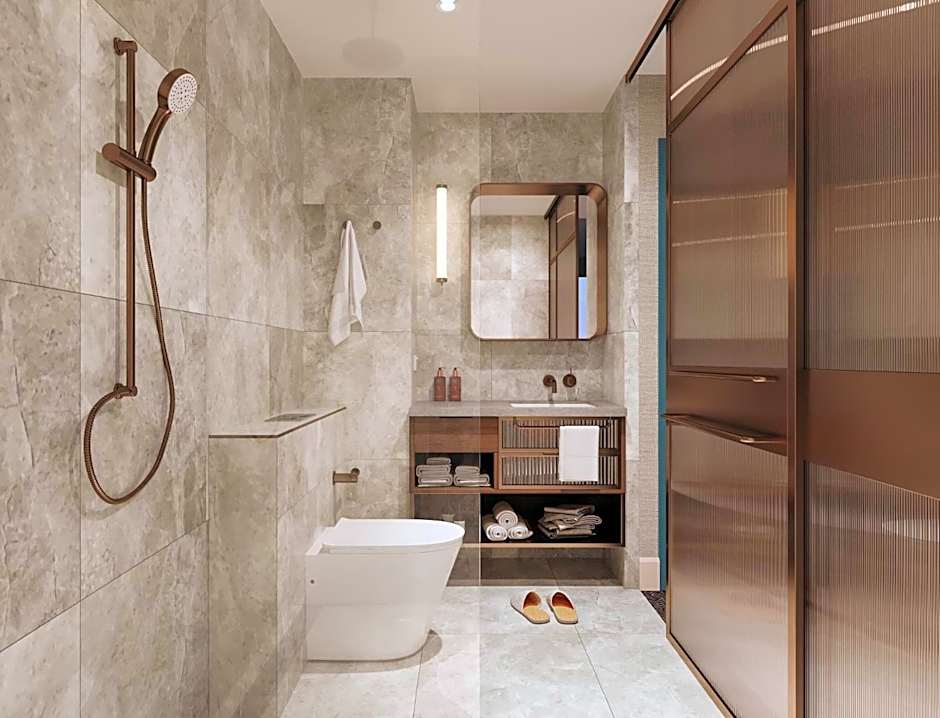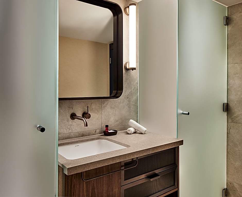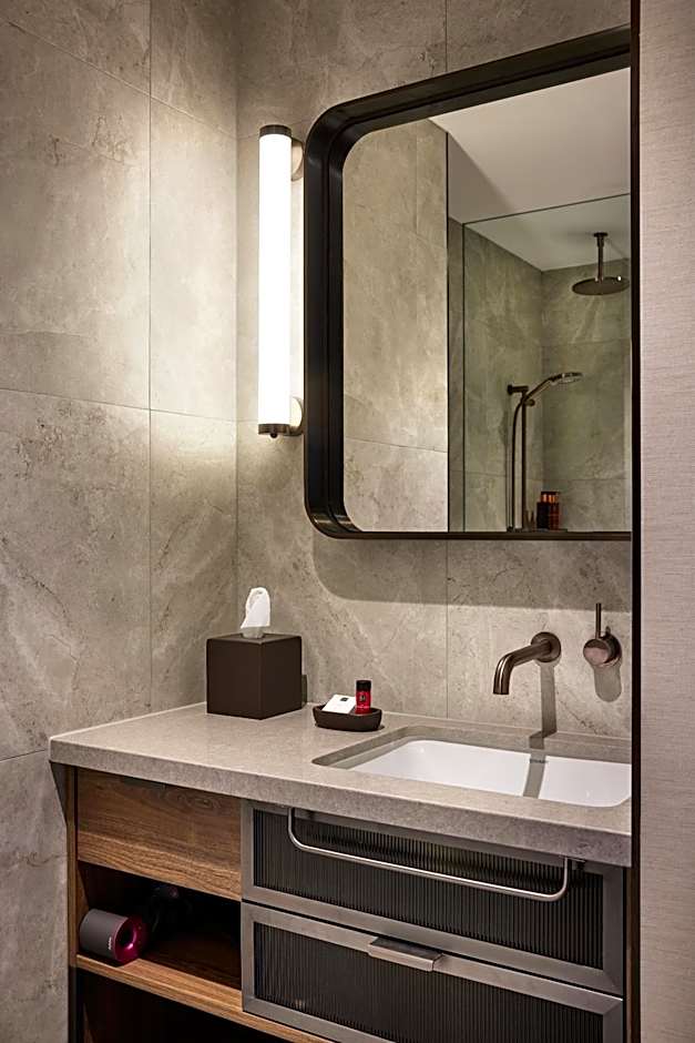 Lovely, compact rooms. The city view was worth paying for. High quality extras- tea bags, coffee pods, biscuits and filtered water taps with sparkling water. Downstairs bar has a small but great menu. Included breakfast (if booked) is a la carte. I enjoyed something different from the breakfast menu every day and they were all really excellent. A quiet dinner there was also very relaxing one night. Easy to eat here as a solo traveller; always felt cosy and relaxed. Staff professional and great.