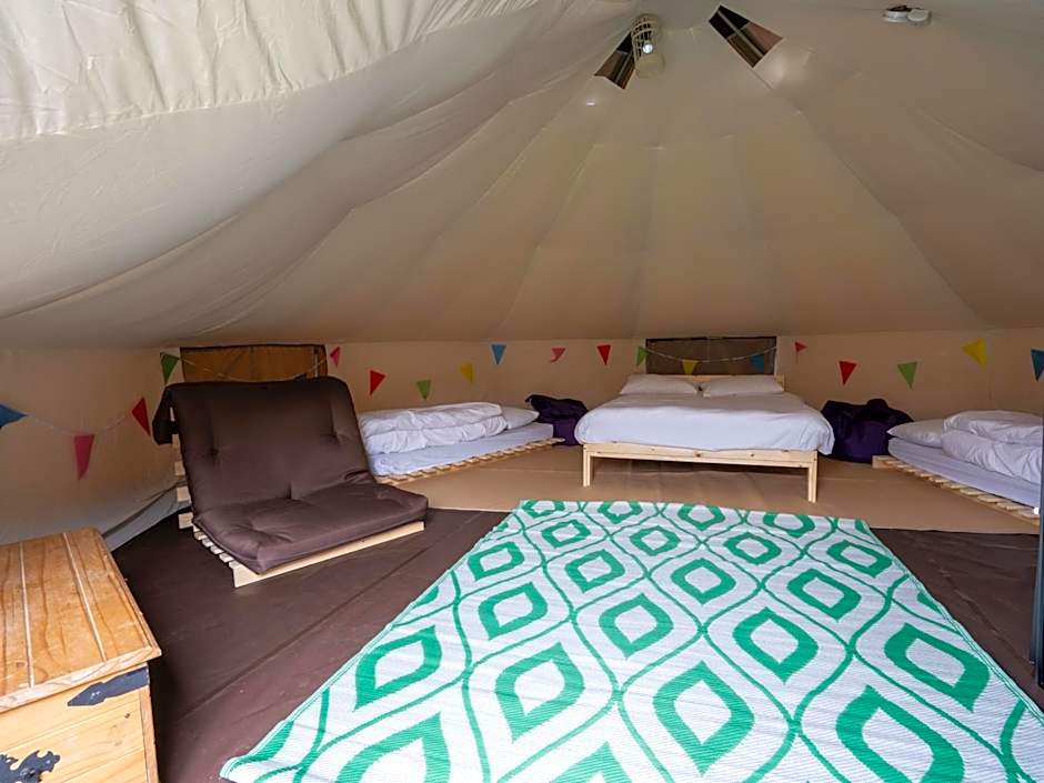 The tent offers a carpeted floor, as well as a shared bathroom featuring a shower. The unit offers 4 futons.