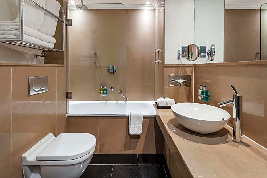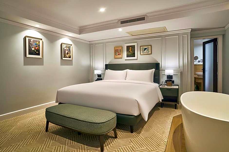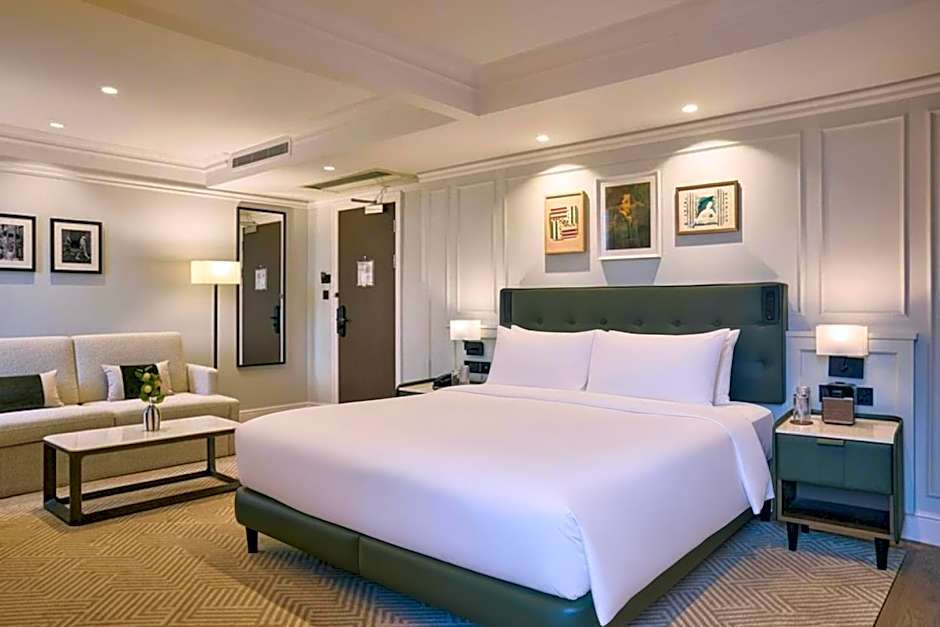 A more spacious room with a king-size bed. The room features a mini bar, air-conditioning, an in-room safe, a digital entertainment system with a flat-screen TV and a iron. It also includes tea and coffee making facilities, complimentary WiFi access, international phone sockets, a seating area.