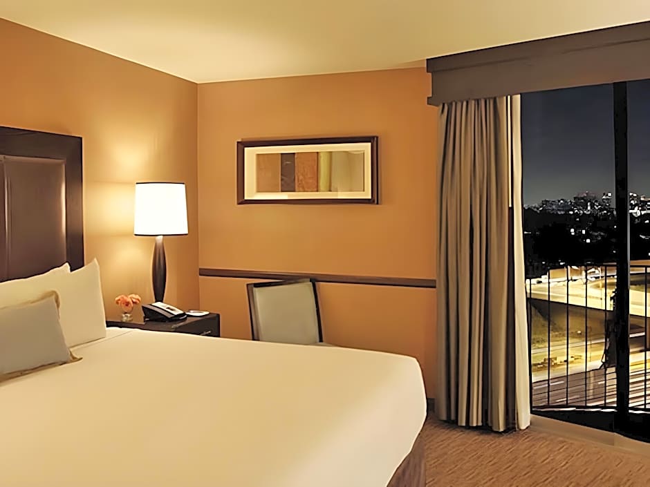 This room features views of the city of Los Angeles through floor to ceiling windows. It also offers a Bluetooth streaming media hub, mood lighting, and free WiFi.