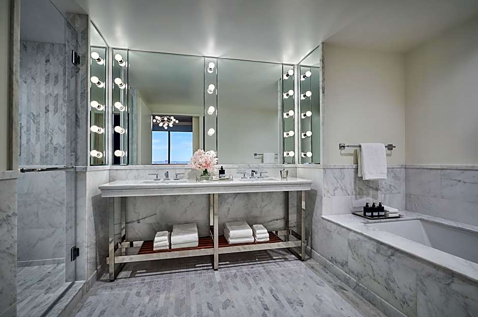 This king room is located on mid-to-high level floors with views of downtown LA and features a full marble bathroom with a shower and upscale bathroom amenities.