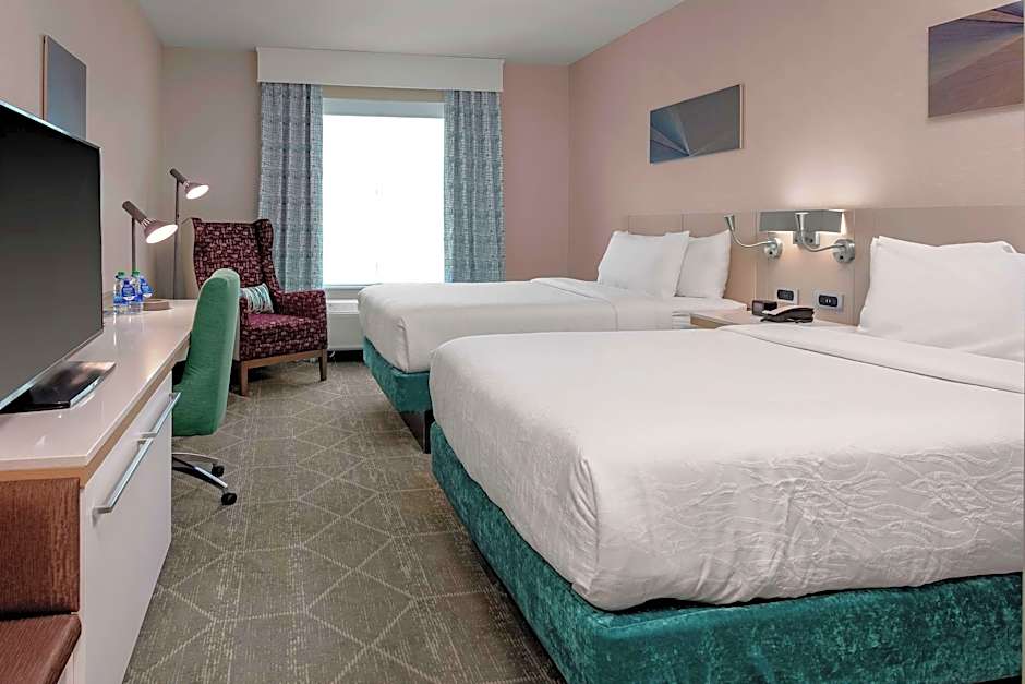 The Hilton Garden Inn Colorado Springs Downtown offers various types of rooms including Queen Room with Two Queen Beds, King Room with Mountain View, One-Bedroom King Suite, and King Room - Mobility/Hearing Accessible with Bath Tub. These rooms range in size from 301 sqft to 603 sqft and have accommodations for 2 adults and 1 child to 4 adults and 3 children. Smoking is not allowed in any of these rooms. The bed sizes vary from Queen size to King size, and some rooms have an additional sofa bed.