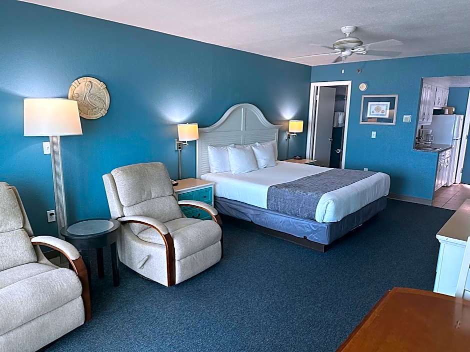 A fully equipped kitchen, dining table, and seating area are featured in this gulf-front studio.