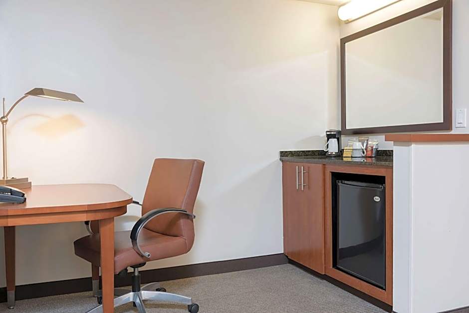 This hearing accessible room includes a microwave, refrigerator, and cable TV. Visual alarm and notification devices are provided.