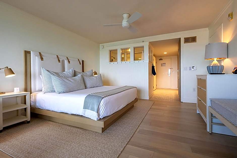 This beachfront king room features a balcony, living area with queen-sized sofa bed, and private bathroom.