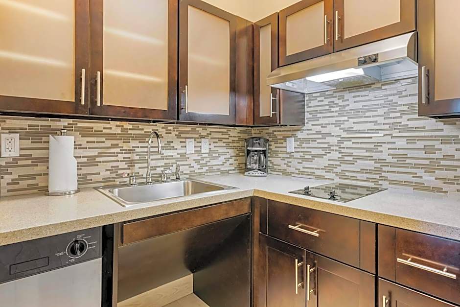 This suite has a kitchenette with a 2-burner stove top, refrigerator, microwave, and dishwasher. A cable TV with DVD player and an private bathroom with a hairdryer are also featured.