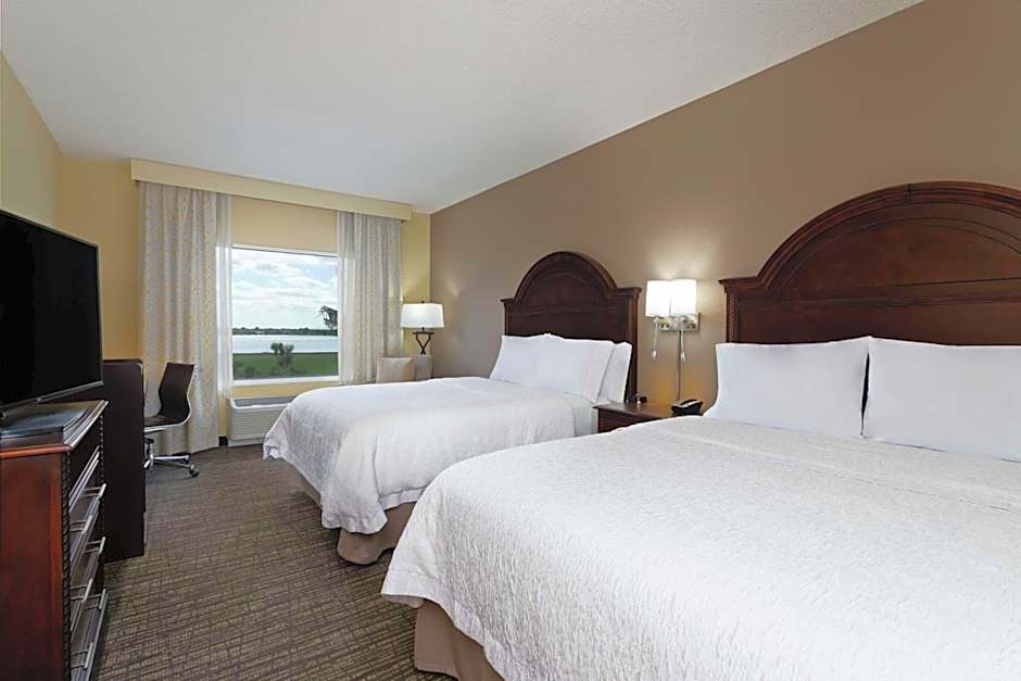 The Hampton Inn & Suites Wellington offers a variety of rooms including apartments, triples, suites, quadruples, and doubles. All rooms are non-smoking and range in size from 452 sqft to 1001 sqft. They accommodate between 2 to 5 adults and 1 to 4 children. The bed sizes vary between king and queen beds. Some rooms also offer a view of the lake.