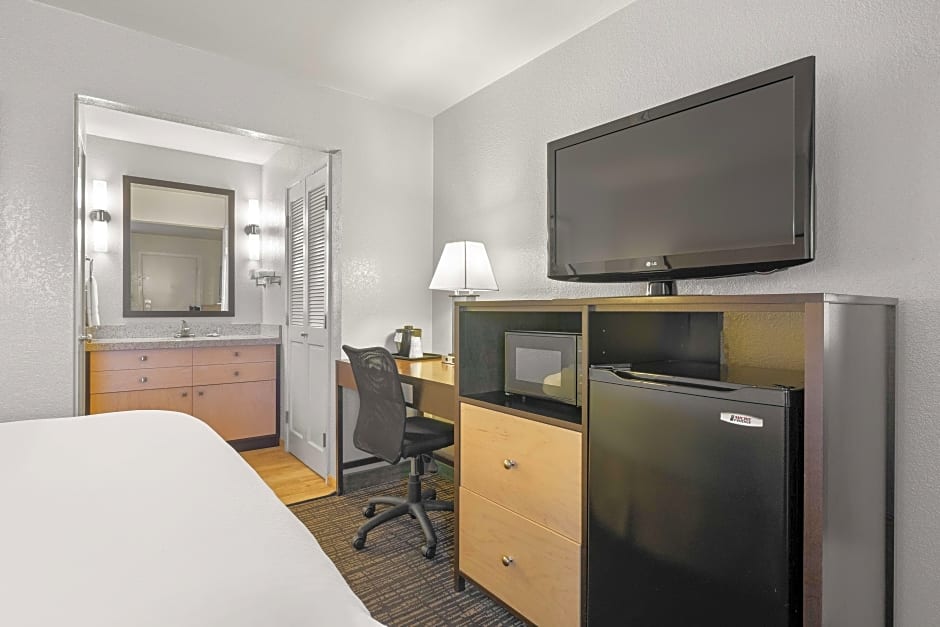 This suite has a cable TV, .microwave, refrigerator, and coffee machine.