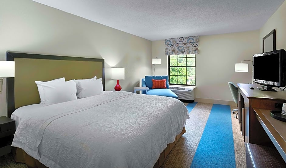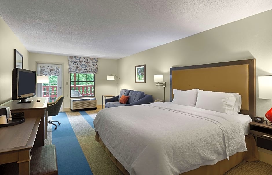 The types of rooms available at the Hampton Inn Helen include King Rooms with River View, King Rooms with Bath Tub - Disability/Hearing Access, King Rooms with Spa Bath, Double Rooms, Non-Smoking Double Rooms with River View, and King Suites with Spa Bath. Occupancy varies from double to quadruple, with accommodations for both adults and children. Smoking is not allowed in any of the rooms. Bed sizes include King and Double beds, with some rooms also featuring sofa beds. Room sizes range from 205 to 301 square feet.