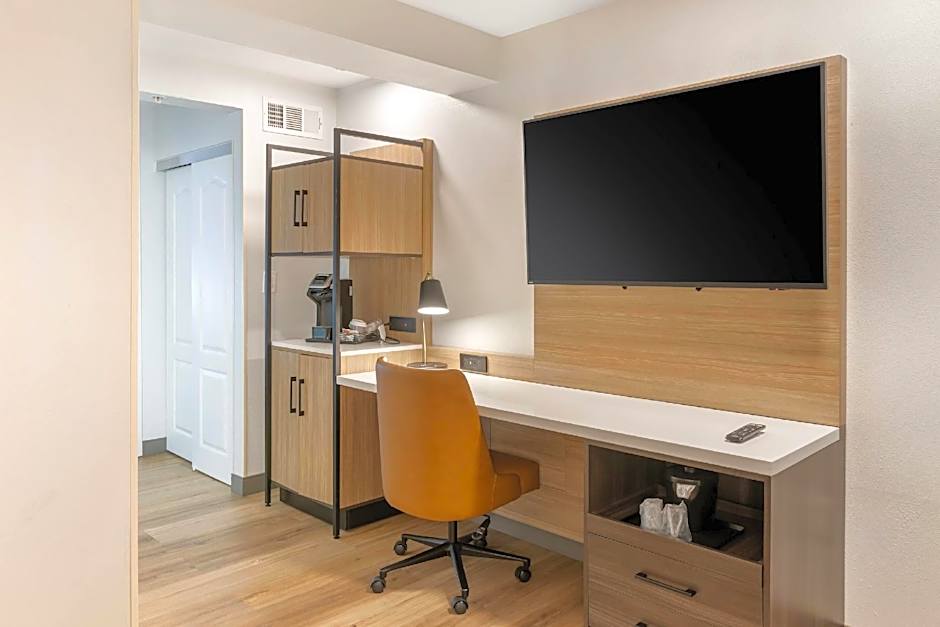 The hotel offers several room options including queen rooms with two queen beds, king rooms, king studios, and a one-bedroom king suite. All rooms are non-smoking and range in size from 301 sqft to 312 sqft. The queen rooms accommodate up to 4 adults and 3 children while the king rooms and king studios accommodate 2 adults and 3 children. The one-bedroom king suite also accommodates 4 adults and 3 children.